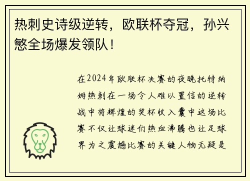 在2024年欧联杯决赛的夜晚,托特纳姆热刺在一场令人难以置信的逆转战中,将辉煌的奖杯收入囊中。这场比赛不仅让球迷们热血沸腾,也让足球界为之震撼。比赛的关键人物无疑是热刺的核心球员——孙兴慜,他用自己惊人的表现和关键时刻的决定性进球,彻底改变了比赛的走势,为球队夺冠立下赫赫战功。